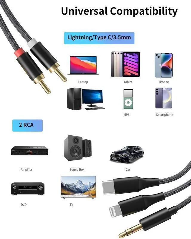 Universal Compatibility One Cable for Many Devices: Supports iPhones, Android phones, laptops, tablets, and more. A reliable solution when you need a Lightning to RCA cable, aux to RCA adapter, or USB-C to RCA audio cable for home theater, amplifier, speaker, or car stereo.