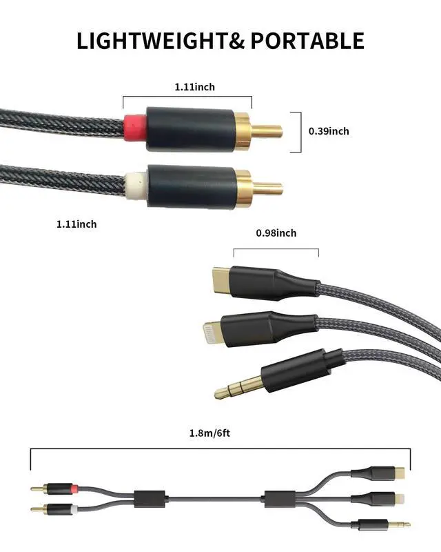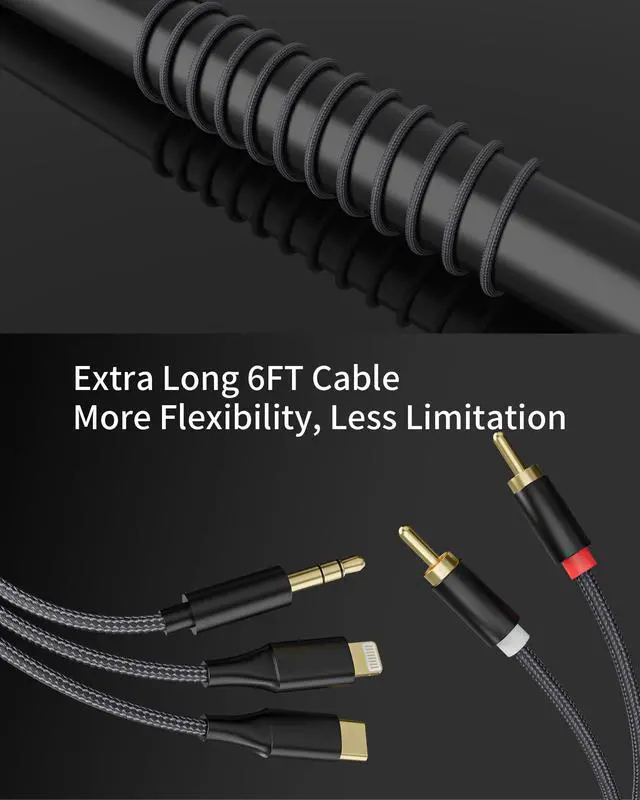 6FT Long Cable Flexible & Convenient: The extended 6FT RCA audio cable lets you connect devices at a distancegreat for car audio setups, living rooms, or DJ booths. Whether its a 3.5mm to RCA, USB-C to RCA, or Lightning to RCA connection, this length offers extra freedom.