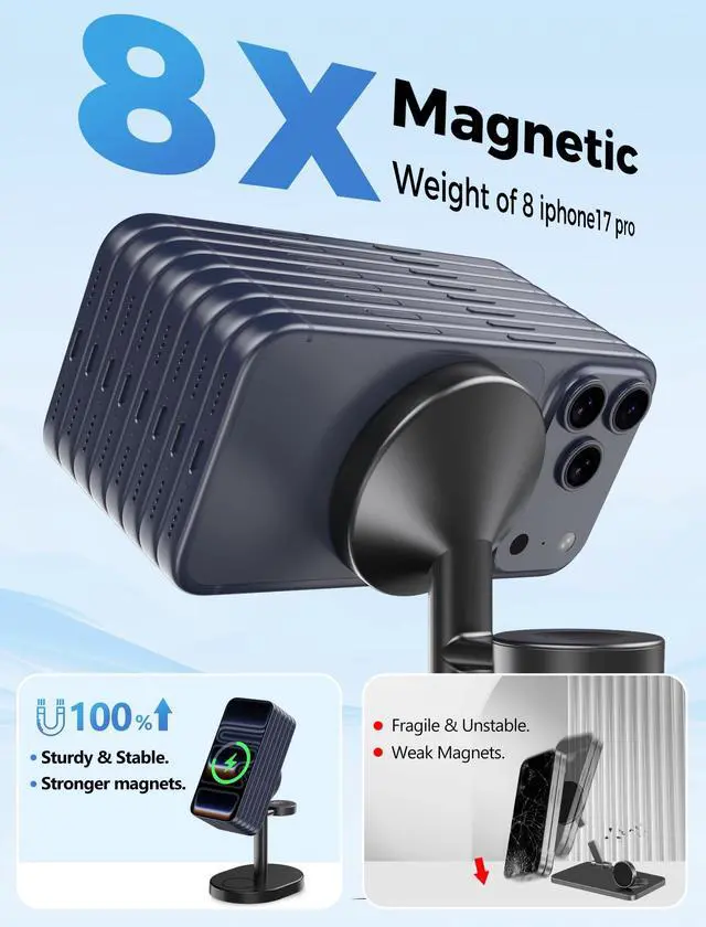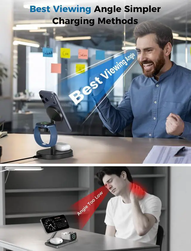3 IN 1 - - Snap and Go! Powerful magnetic alignment brings the accurate sweet point and seamless charging to iPhone and iWatch without device drops! 360° vertical and horizontal charging make watching videos and checking the information received ever so handy.