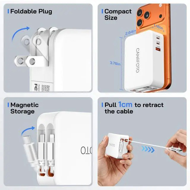 Fast Charging, Foldable Plug, Two Retractable Cables, Caniifoto, REWA5P, USB Type C, Compatible with nearly all electronic devices, including iPhone 17/17 Pro/17 Pro Max/17 Air/16/15/14/13/12/11/SE/XR/XS/X/8, iPad Air/Pro/Mini, AirPods Pro, Samsung Galaxy S25/S24/S23/S22/S21/S20/S10/S9/S8/A12/A13/A22/A32/A52/A53/A71/Note 20/10, LG, Motorola, Google Pixel, tablets, Switch, and other digital devices.