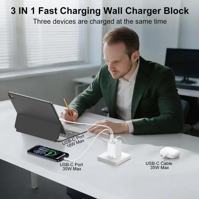 35W Retractable Wall Charger Adapter cargador para features USB C & USB A port and Type C Cord, free you from messy chargers for various interfaces, can charge 3 devices at the same time.