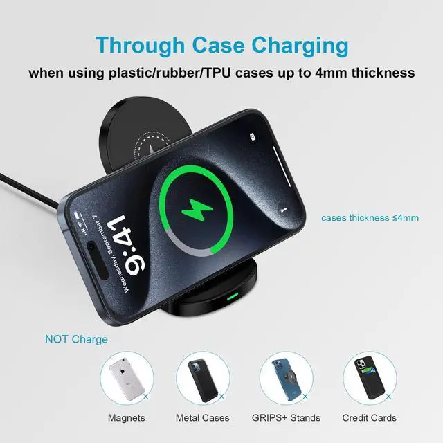 2. Cases made of metal, cases with attachments such as magnets, metal ring, pop socket, cards, grips will interfere charging