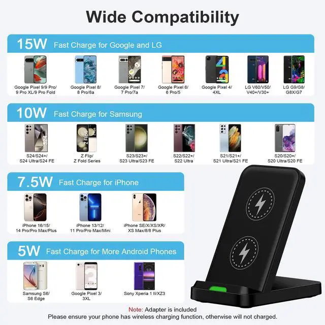 • 4 Charging Modes Wide Compatibility- 15W fast charge for Google Pixel 10 Pro XL/10 Pro/10 Pro Fold/10/9a/9 Pro/9 Pro XL/9/9 Pro Fold/8a/8 Pro/8/7a/7 Pro/7/6/6 Pro/5/4;LG V60/V50/G9/G8/G7;for moto razr/razr+(2025/2024),Moto Edge(2025/2024/2023),for Moto G Power 5G 2025/2024,Moto G Stylus 5G 2025/2024;10W fast charge for Samsung Galaxy S25 Edge S25 FE S24 Ultra S24 FE S24+ S23 FE S22 S21 S20 S10 S9 S8,Z Fold/Flip 7 6 5 4; 7.5W fast charge for iPhone 17/17 Air/17 Pro/17 Pro Max/16e/16/16 Plus/16 Pro/16 Pro Max/15/14/13/12/11/X/XS/XR/XS MAX/SE 2;5W standard charge for Samsung s6/s6 edge,Pixel 3/3xl etc.(Please ensure your phone support wireless charge before purchase.)