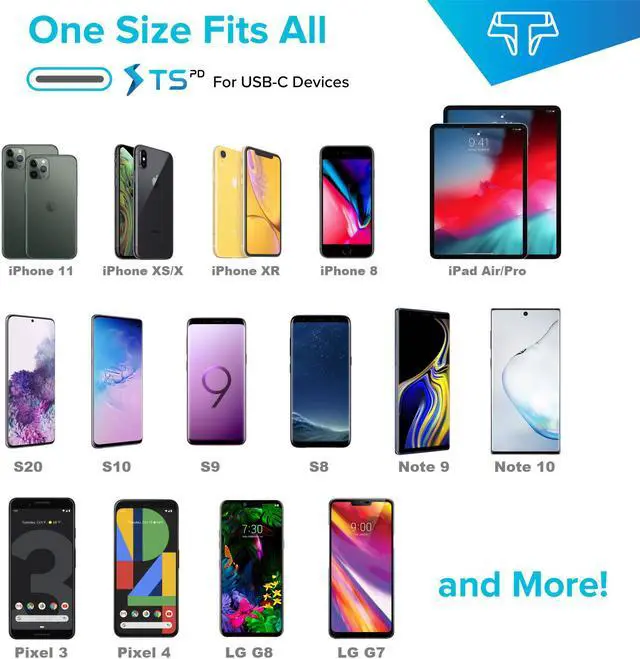 Compatible with all smartphones and tablets such as iPhone 15, 14, 13, 12, 11, XS, XR, SE, X, iPad Air/Pro, MacBook Air, Chromebook, Samsung Galaxy S23, S22, S21, S20, S10, S9, Folio, Fold, Note, Tab, Androids, LG, HTC, Motorola, Sony, Google, Pixel, Small USB electronics, and more