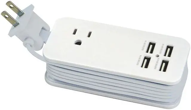 charge up to 5 devices: 4 usb, 1 standard outlet organize scattered phone or tablet chargers in one place 5ft. extendable cord for increased flexibility compact design built-in hooks for cord storage max output: dc 4, 200ma Colors: Blue, White