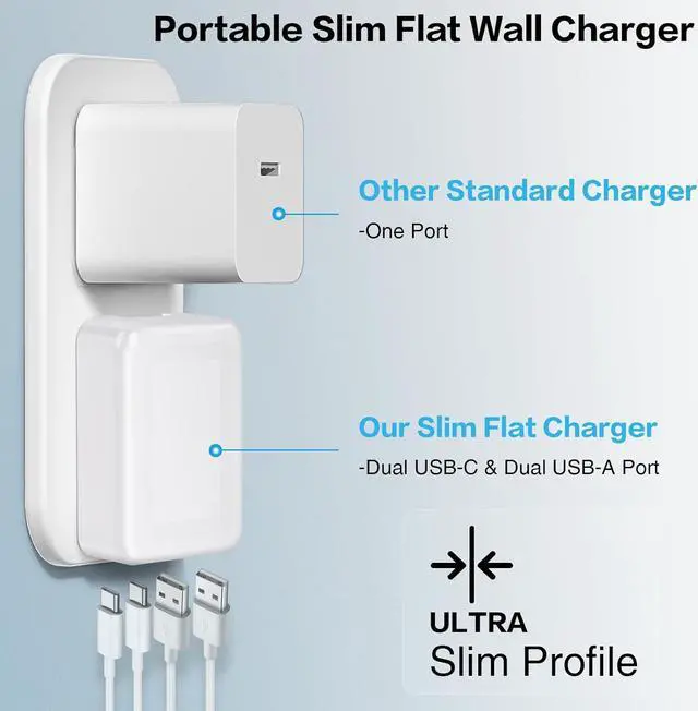 - The USB C wall charger has a Flat & Foldable plug design that allows you to easily reach hard-to-reach wall outlets behind sofas, beds, and nightstands