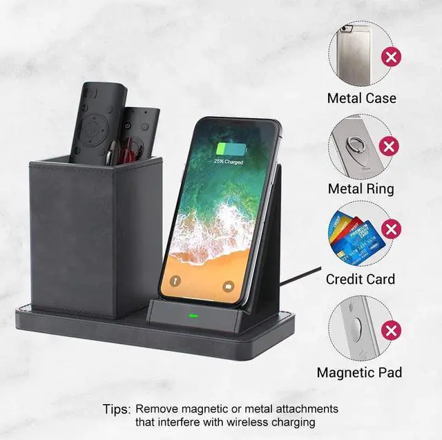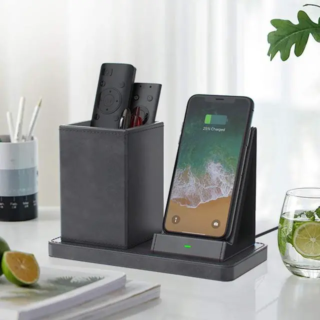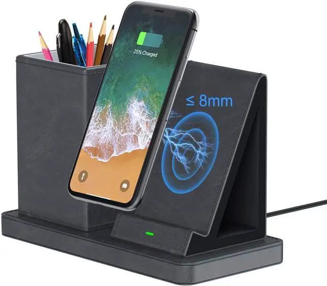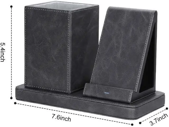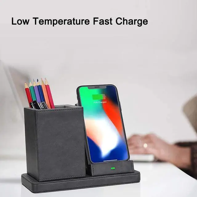 ORGANIZING IN STYLE - This modern, space saving design is made from a high quality, durable PU leather. It holds phone upright and visible on the desk. Never miss calls or messages while charging wirelesslyNO MORE CLUTTER - Use your home or office space more efficiently by keeping your accessories organized and off the desk and work space. No hunting for phone charge cablesTHE FAST CHARGER delivers up to 10W of wireless charging power and Works with Qi wireless charging phones/devices - including iPhone 11/XS Max/XS/XR/X/8/8 plus and Samsung Galaxy S20/10/9/8/7, note10/9/8 and more.