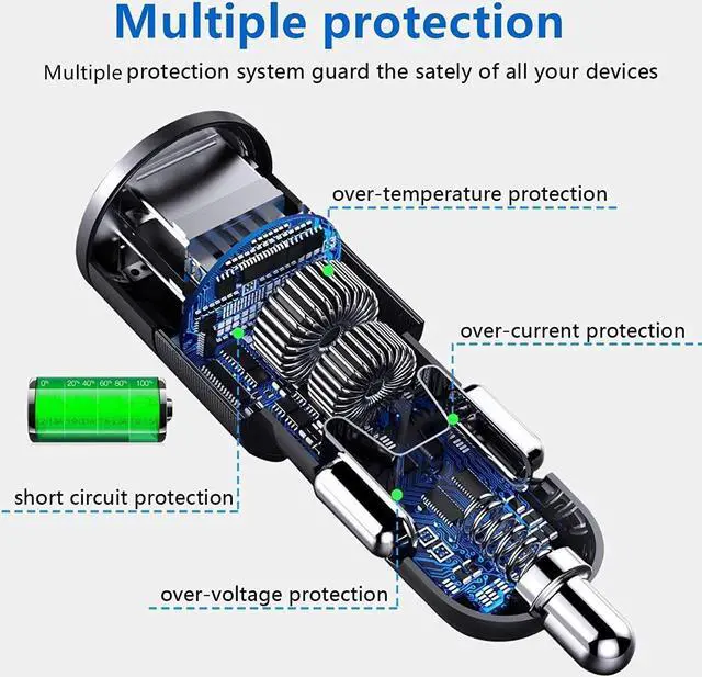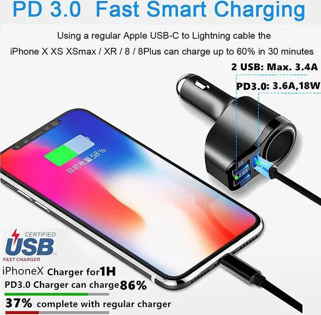 - CHARGING THREE DEVICES SIMULTANEOUSLY[USB C 5V/3.6A (PD3.0 port) and dual USB A 5V/3.4A (Dual ports total max)]multiple ports USB car charger fast charge, equipped with a USB-Type-C port compatible with Power Delivery3.0, full-speed charging is possible. Simultaneously, the devices that do not support PD will also be sent the optimal current(5V/3.4A 2 ports total max).This Cigarette lighter USB charger can charge 3 devices (iPhone, iPad, Galaxy, Xperia, Android, etc.) simultaneously.