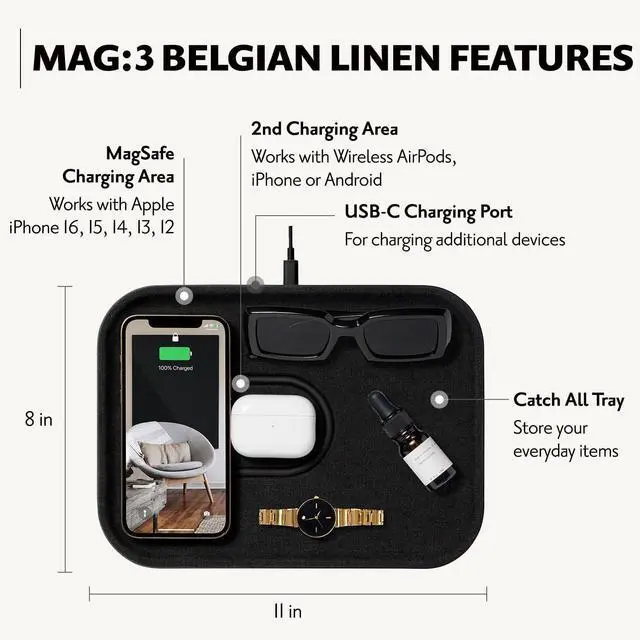 MAG: 3 2-in-1 charging tray matches your most-loved decor items. Perfect to blend-in or enhance decor, our premium Belgian Linen meets the gold standard for carbon neutrality and environmental consciousness, with top ratings for product safety and social responsibility (OEKO-Tex Standard 100 certified).
