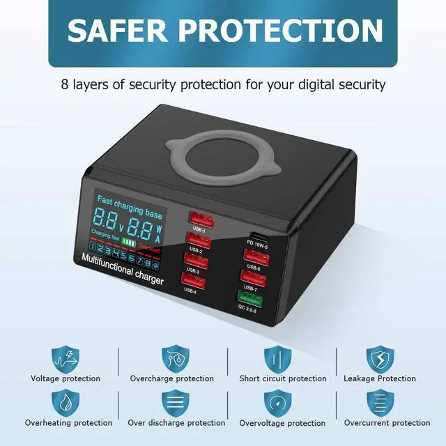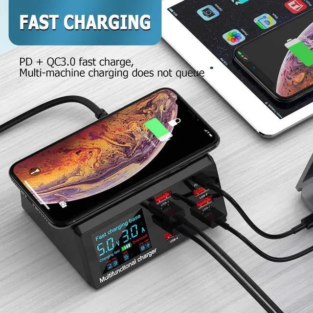 Through the LCD digital display, it can intelligently display the current and charging status of each charging port on the screen. The light and compact USB charging station can be placed on a table or elsewhere. Just one socket hole can fill multiple devices at the same time, and no longer need to be fixed on the socket like an ordinary wall charger. It is the best ideal choice for home, office international travel and desktop use.
