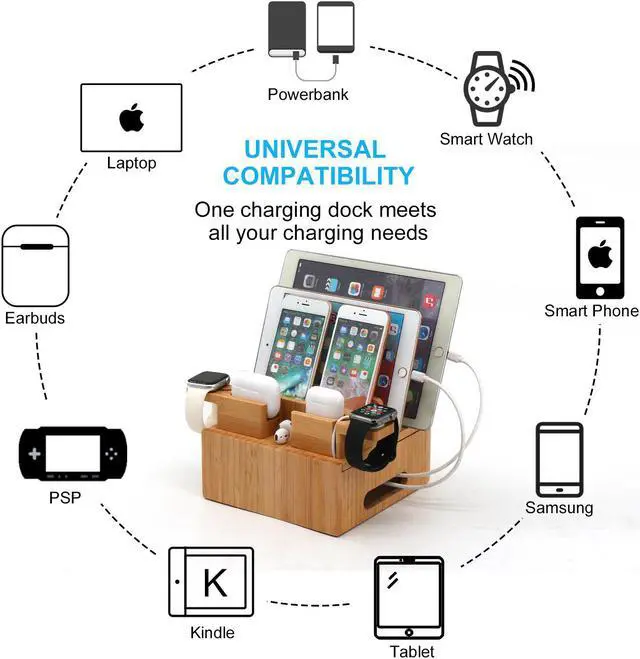 What You Get - 1 Bamboo Upgrade Charging Station, 2 Integrated Watch & Earbuds Stand, 5 Charging Cables. Eco friendly and Sturdy - Made of 100% natural bamboo, classic design lasts and goes well with all sorts of interior designs of your home and office. Fashion Creative Design - Magnetic Wide base- allows you to hide all cables and power strips or USB hubs, USB chargers and keep the cables neatly and save space. Mobile Watch&Earbuds Stand- you can arbitrarily place your Watch and Earbuds thus it is space-saving and charging easily.