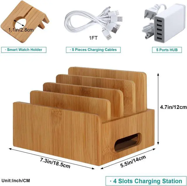 The extra charging HUB is compatible perfect with most devices to meet with your daily charging requirements. A spacious bamboo storage base is (6.7*4.9*2.2inch) in dimensions which can hold 4/5/6 ports HUB inside. Keeping your space in order, adding elegant element to your area.