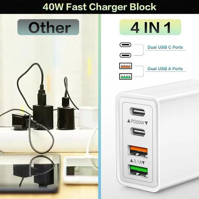 ![Alt view image 4 of 7 - USB C Wall Charger, [2 Pack] 40W 4 Ports Fast Charging Block Double USB C Charger Dual Port PD+QC Wall Plug Multiport Type C Charger Block for iPhone 15 14 13 12 11 Pro Max ,Android Phones, Tablet](https://c1.neweggimages.com/productimage/nb640/AMYDS2401050HCVBL6E.jpg)