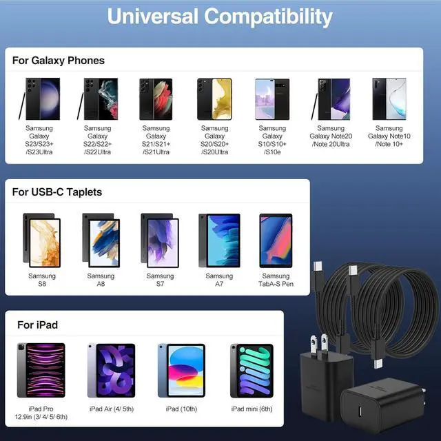 ? Universal For S25 Ultra/S24 Fast Charger45W type c super fast charger and cable support multiple fast charging technologies including for Galaxy super fast charging PD 3.0 PPS and QC 4.0. It provides fast-charging up to 45W output super-fast charging for Galaxy S25 /S25 Plus /S25 Ultra S24 Ultra/S24/S23Ultra/S23/S23+/S22/S22Ultra/S22+/S22Plus/S21/S21Ultra/S21+/Note20/Note20Ultra/Note10+. iPhone 16 Pro Max/ iPhone 16 Pro/ iPhone 16/ iPhone 16 Plus also for iPhone 15/ iPhone 15 Plus/ iPhone 15 Pro/ iPhone 15 Pro Max iPad Pro 11 inch 4th/ 3rd/ 2nd/ 1st iPad Air 5/4th iPad Mini 6th iPad 10th Generation.? 10FT Extra Long Type C to Type C Cable The 10ft USB-C charger cables are long enough for you to lie on the bed sofa in the car or office anywhere you need them.