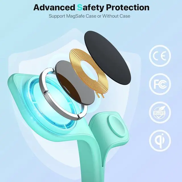 This fast wireless charger compatible with mag-safe charger has advanced CE, RoHS and FCC certifications to provide you with safe charging experience.