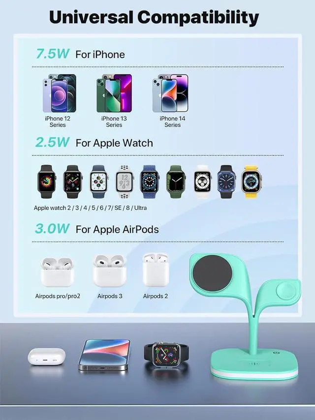 Our wireless charger Equipped with massive heat radiator holes, it charges your iPhone, Airpods, and Apple Watch simultaneously without being hot, ensuring your charging safety.