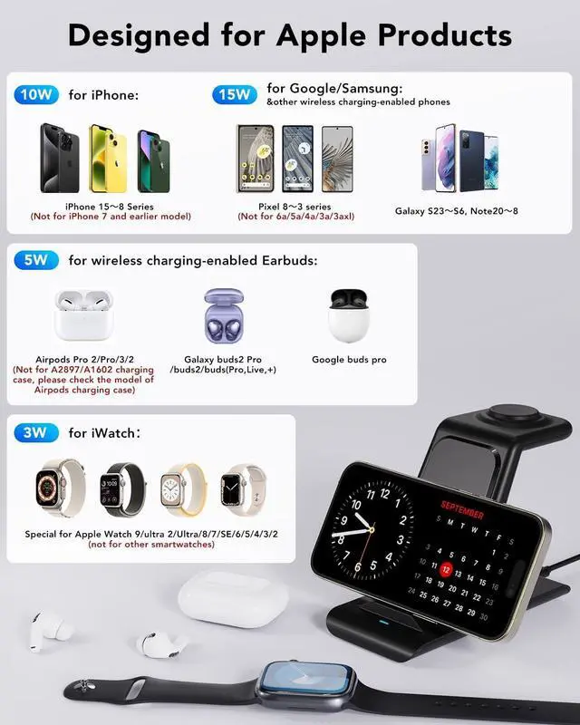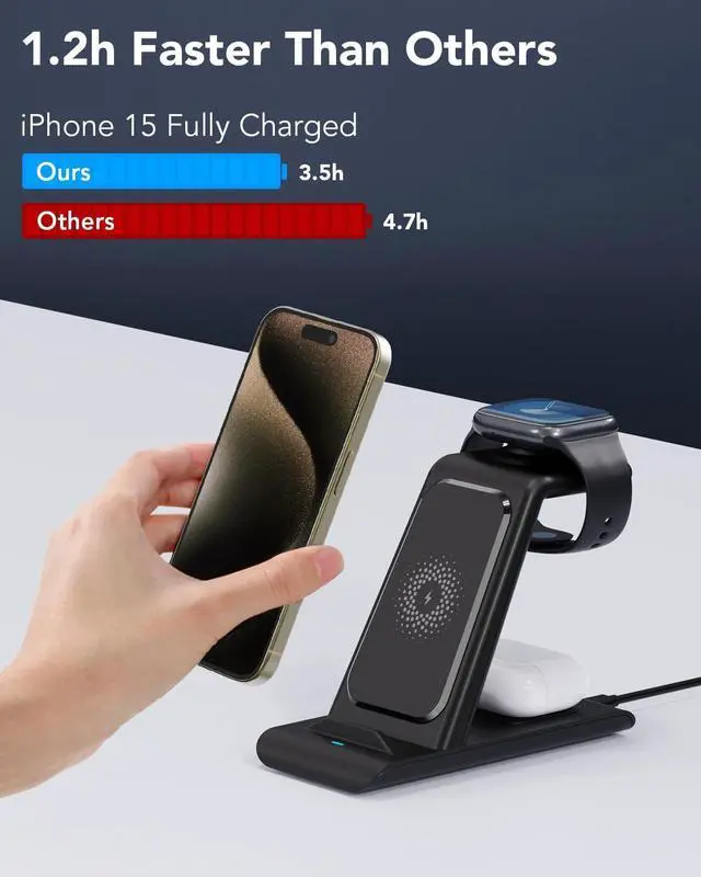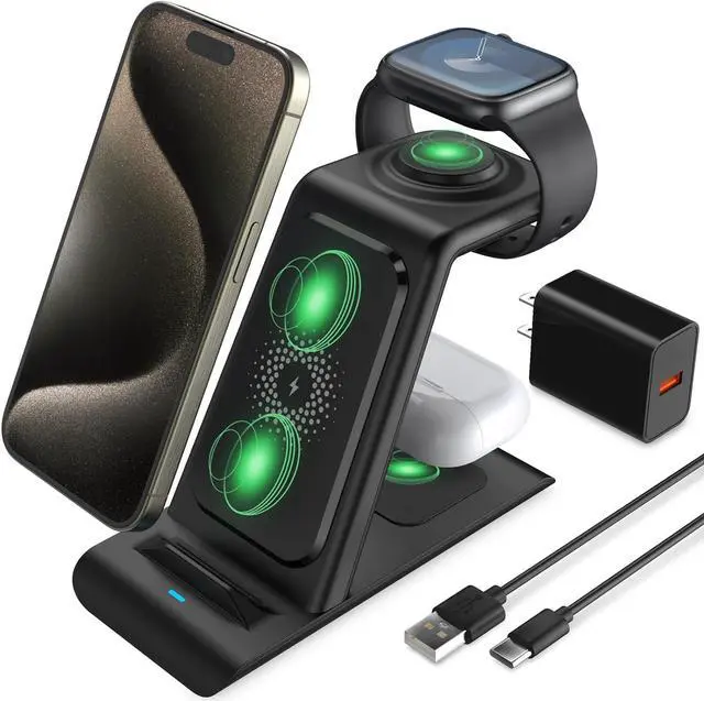 Wireless Charging Station: fast charging for iphone apple watch and airpods, compatible with iphone 15 Plus /15/ iphone 15 Pro Max /15 Pro/ 14 plus /14/ 14 pro max /14 pro/ 13 Pro Max /13 Pro/13/13mini/12/12 mini/ 12 Pro/12 Pro Max/ 11 pro Max /pro/SE 2/XR/X/XS/XS Max/11/8 plus/8, Apple Watch Ultra (2) / 9 / 8 / 7 / 6 / 5 / 4/3/2/SE, Airpods pro 2 /pro/3/ 2, and other wireless charging-enabled phones buds such as samsung google products.