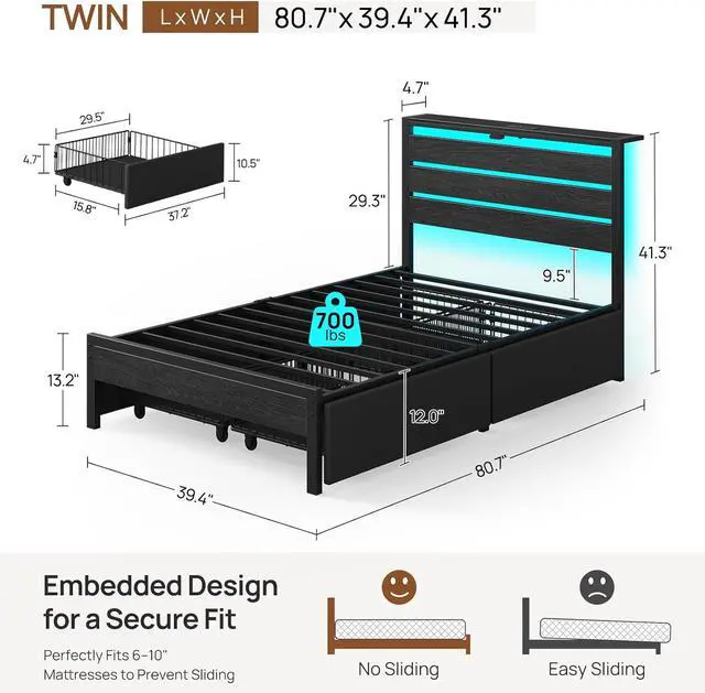 Rolanstar Twin Bed Frame with 4 Drawers, LED Lights and Charging Station, Metal Platform Bed with Storage Headboard, Noise Free, Easy Assembly, No Box Spring Needed, Black