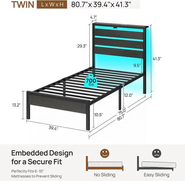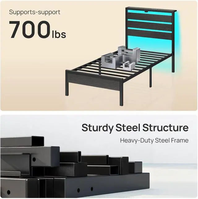 Rolanstar Twin Bed Frame with LED Lights and Charging Station, Wood Storage Headboard and Under Bed Storage, Metal Platform Bed, Easy Assembly, No Box Spring Needed, Balck Oak