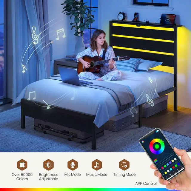 Multi-functional LED Bed Frame: Experience sophistication with the Rolanstar metal bed frame, heightened by vibrant multi-colored RGB LED light strips. Utilize the mobile app to explore a spectrum of over 60,000 colors, and customize brightness, color, mode, and timer settings according to your preferences. Enhance the overall experience by syncing the LED lights with music, creating a romantic and dynamic party atmosphere