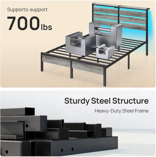 Multi-functional LED Bed Frame: Experience sophistication with the Rolanstar metal bed frame, heightened by vibrant multi-colored RGB LED light strips. Utilize the mobile app to explore a spectrum of over 60,000 colors, and customize brightness, color, mode, and timer settings according to your preferences. Enhance the overall experience by syncing the LED lights with music, creating a romantic and dynamic party atmosphere