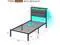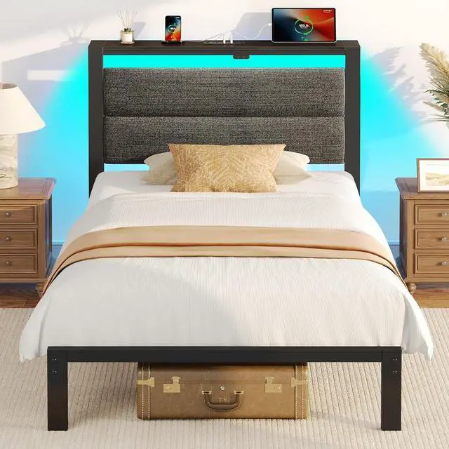 Rolanstar Bed Frame Twin Size with Charging Station, LED Twin Bed Frame with Upholstered Storage Headboard, Platform Bed with Metal Slats & Under Bed Storage, No Box Spring Needed, Noise Free, Grey
