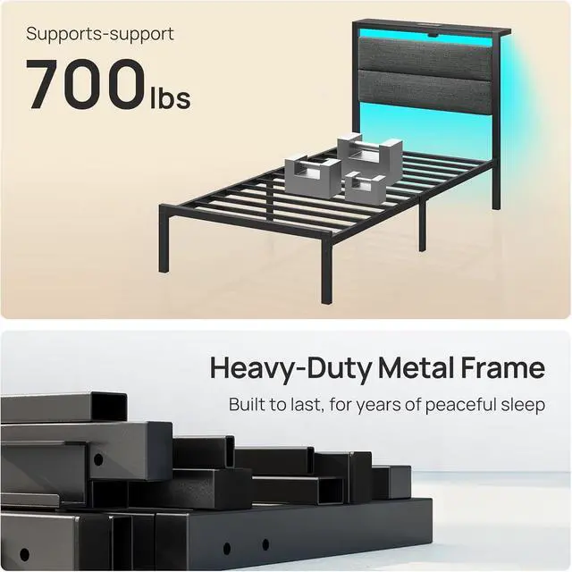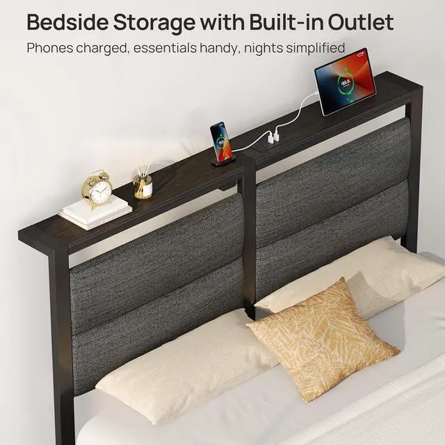 Generous Under-Bed & Headboard Storage Take advantage of ample under-bed space for boxes, shoes, or blankets, while the headboard offers convenient storage for books, phones, and other essentials. The raised metal frame also allows robot vacuums to glide under, keeping your bedroom tidy and clutter-free.