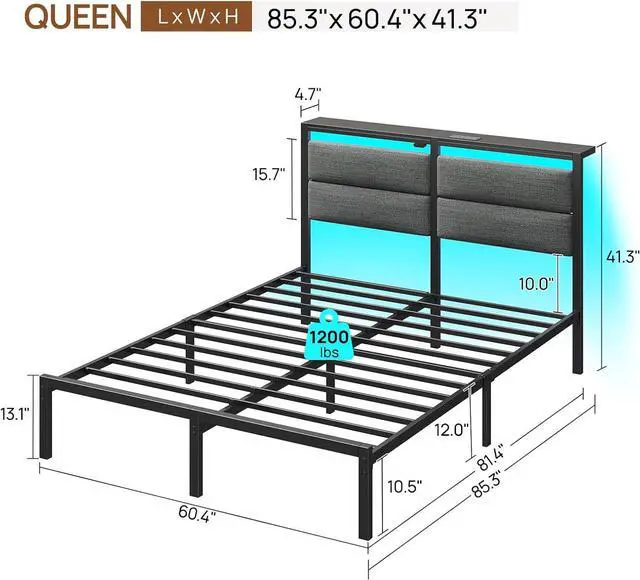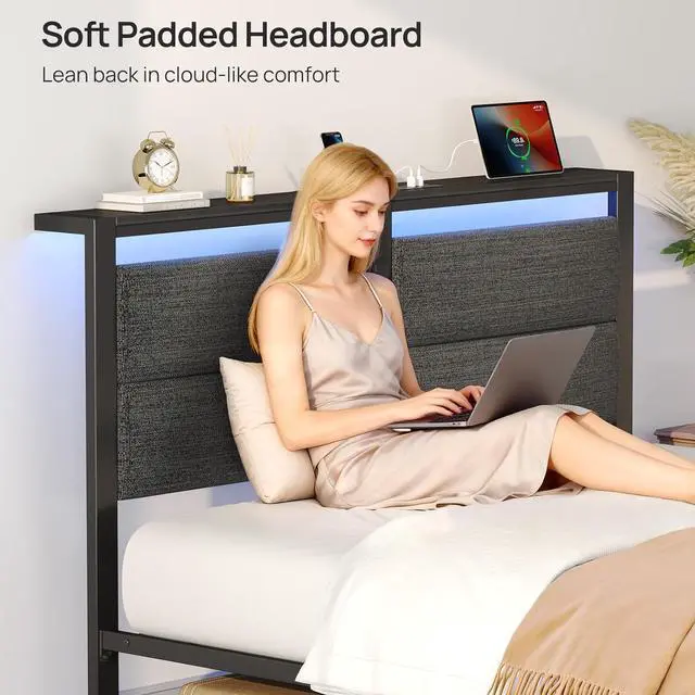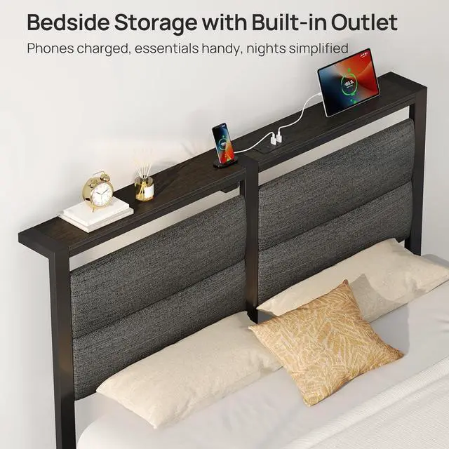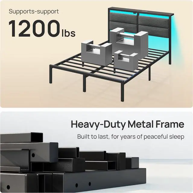 Generous Under-Bed & Headboard Storage Take advantage of ample under-bed space for boxes, shoes, or blankets, while the headboard offers convenient storage for books, phones, and other essentials. The raised metal frame also allows robot vacuums to glide under, keeping your bedroom tidy and clutter-free.