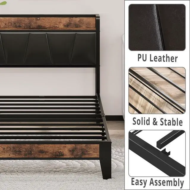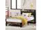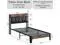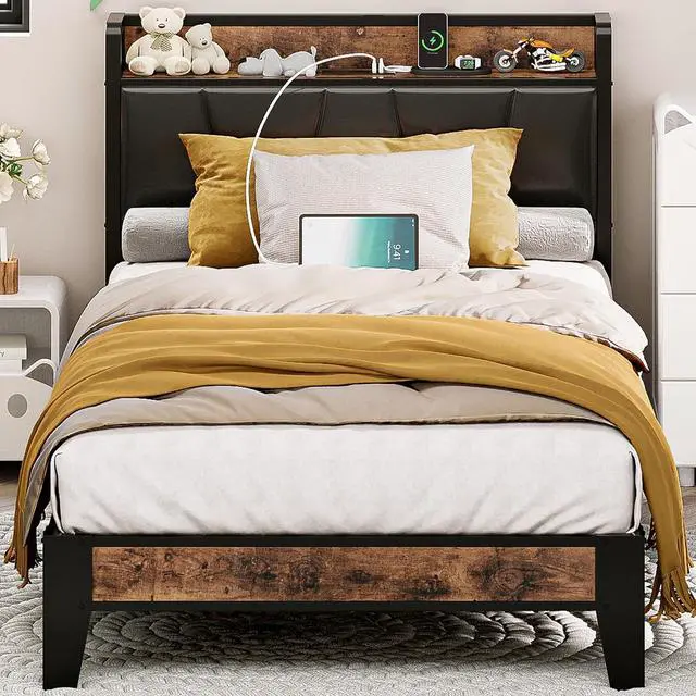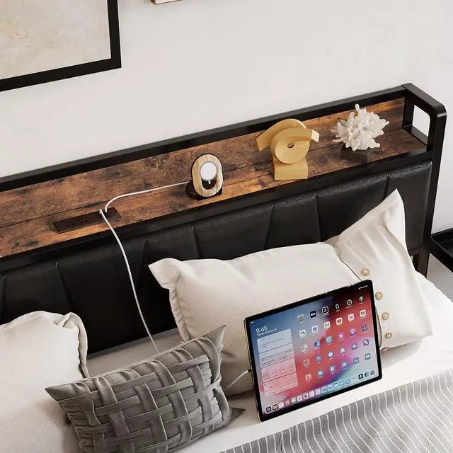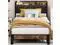 The vintage shelf and gray upholstered headboard combine practical and comfortable to match any style of the room. The bed frame made of FSC-Certified wood