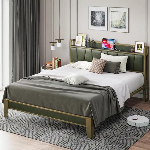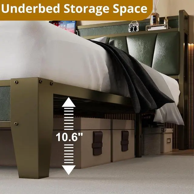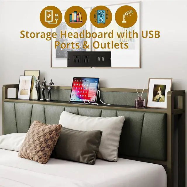 LIKIMIO Full Bed Frame, Storage Headboard with Charging Station, Solid and Stable, Noise Free, No Box Spring Needed, Easy Assembly (Dark Green)