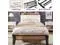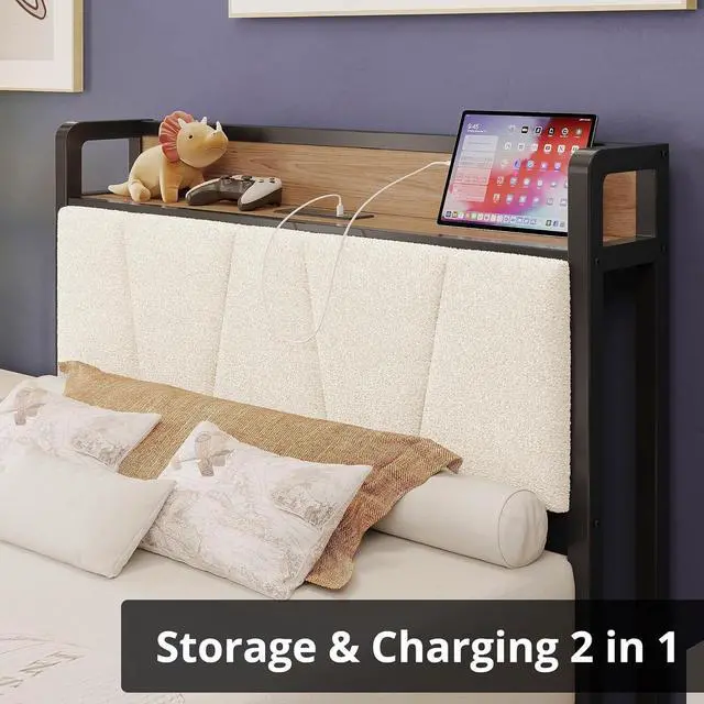 The vintage shelf and gray upholstered headboard combine practical and comfortable to match any style of the room. The bed frame made of FSC-Certified wood
