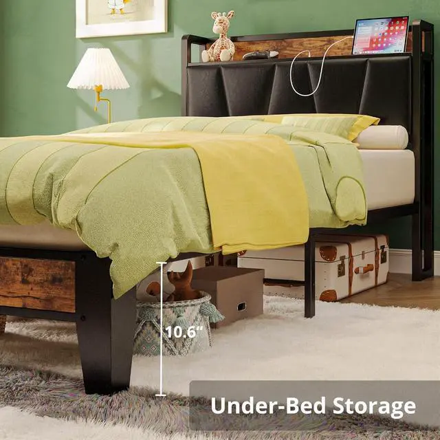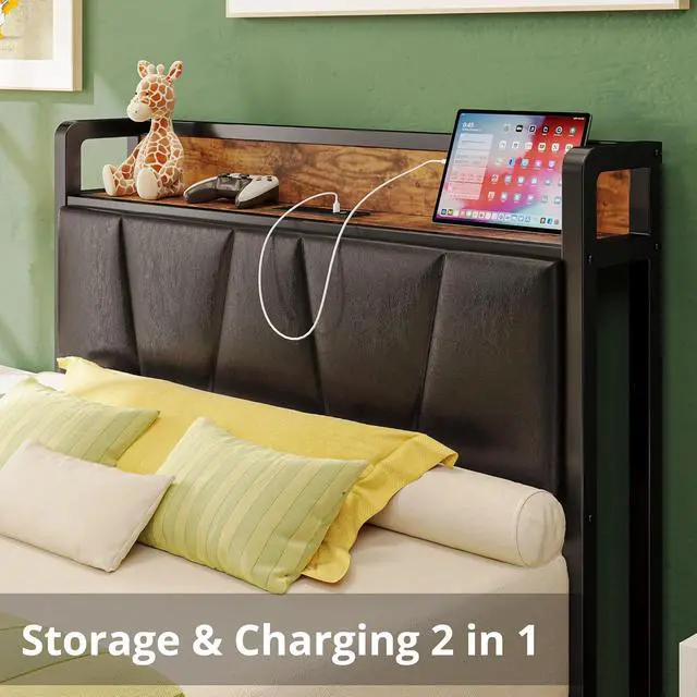 LIKIMIO Twin XL Bed Frames, Storage Headboard with Charging Station, Solid and Stable, Noise Free, No Box Spring Needed, Easy Assembly (Vintage and Black)