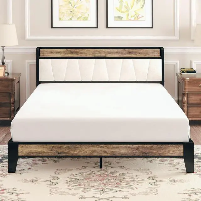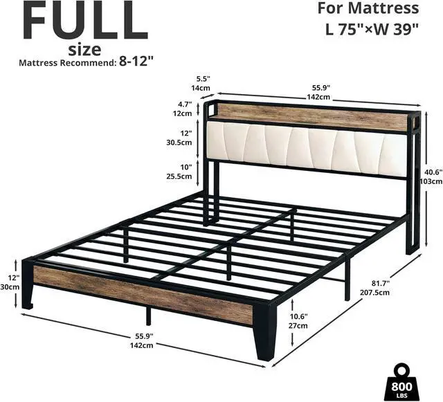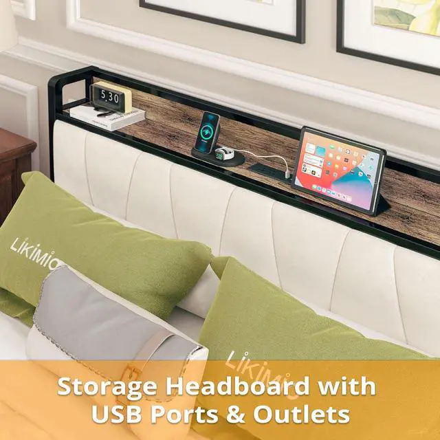 LIKIMIO Full Size Bed Frame, Storage Headboard with Charging Station, Solid and Stable, Noise Free, No Box Spring Needed, Easy Assembly (Walnut and Beige)