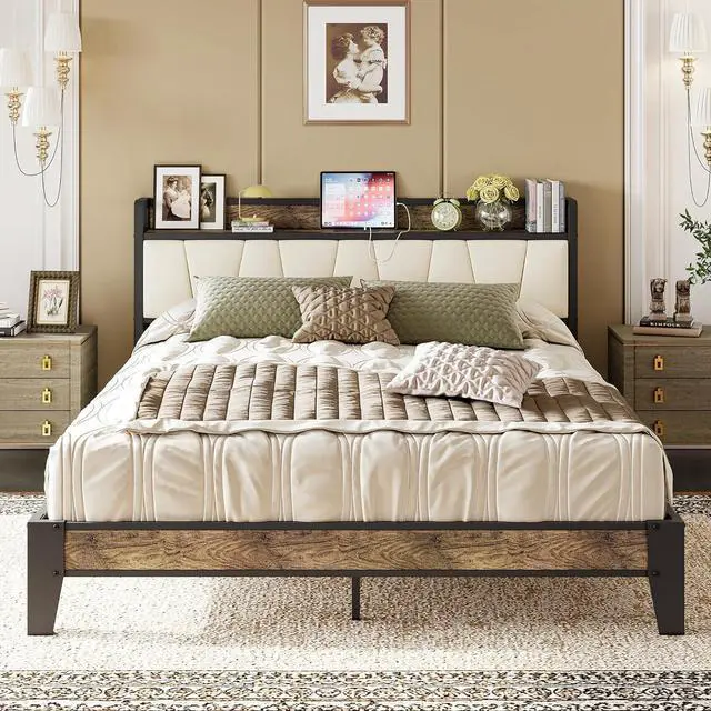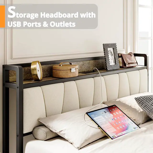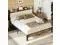 The vintage shelf and gray upholstered headboard combine practical and comfortable to match any style of the room. The bed frame made of FSC-Certified wood