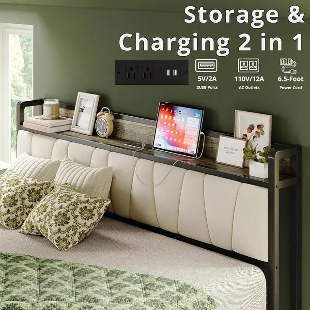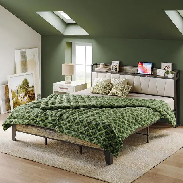 LIKIMIO California King Bed Frame, Storage Headboard with Charging Station, Solid and Stable, Noise Free, No Box Spring Needed, Easy Assembly (Walnut and Beige)
