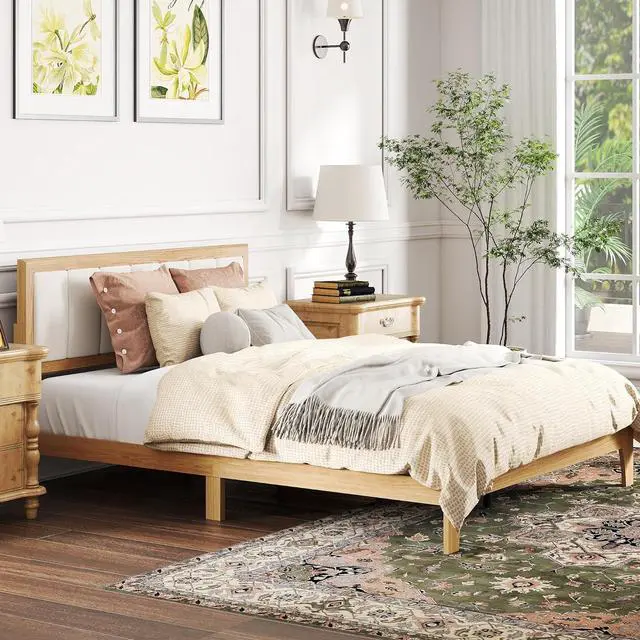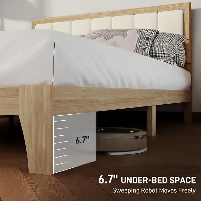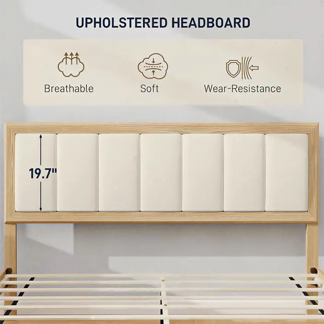 Elegant Design & Comfort: Featuring an upholstered headboard for maximum comfort during relaxation or reading sessions, this full bed frame blends a linen-look fabric with a wood grain finish, offering a mid-century modern style to any bedroom decor