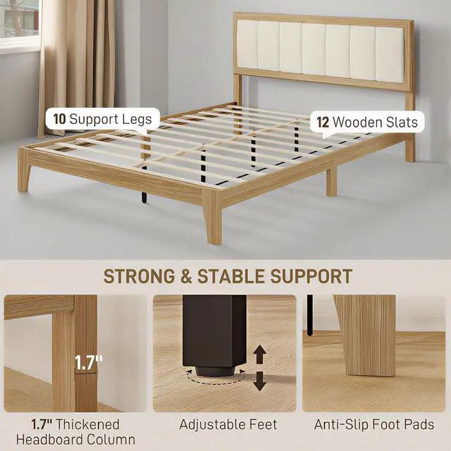 Robust & Reliable Structure: Constructed with 12 wooden slats and 10 supporting legs, plus solid wood strips and 1.7" thick headboard columns, this bed frame provides a stable foundation with adjustable feet and anti-slip pads, supporting up to 726 lbs