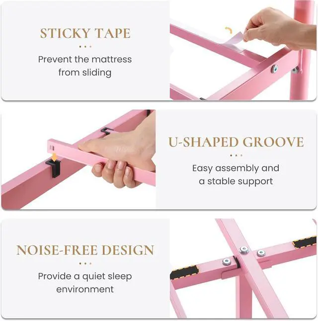 Noise-Free: The gold bed frame provides an EVA sponge to help cushion the contact between slats and reduce potential noise caused by friction. Greatly improve the quality of sleep by minimizing disturbances from creaking or rattling sounds
