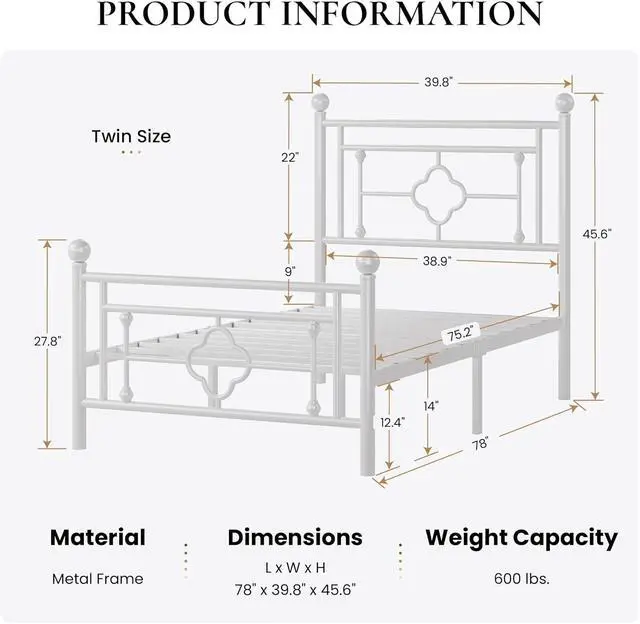 Modern Design: With its sleek and minimalist design, our twin bed frame with headboard and footboard adds a touch of elegance and sophistication to any bedroom decor. Whether a contemporary or classic style, this victorian frame seamlessly blends in with its surroundings