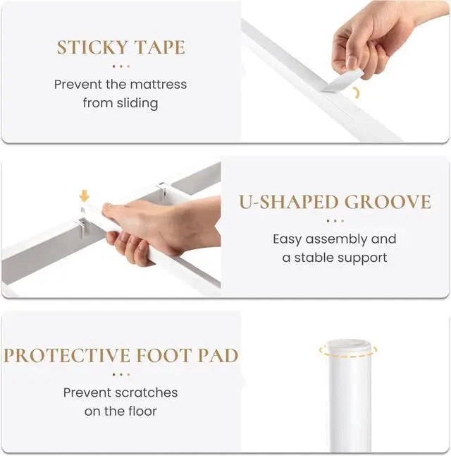 Noise-Free: The gold bed frame provides an EVA sponge to help cushion the contact between slats and reduce potential noise caused by friction. Greatly improve the quality of sleep by minimizing disturbances from creaking or rattling sounds