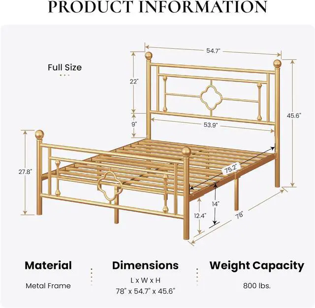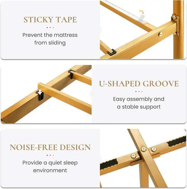 Noise-Free: The gold bed frame provides an EVA sponge to help cushion the contact between slats and reduce potential noise caused by friction. Greatly improve the quality of sleep by minimizing disturbances from creaking or rattling sounds