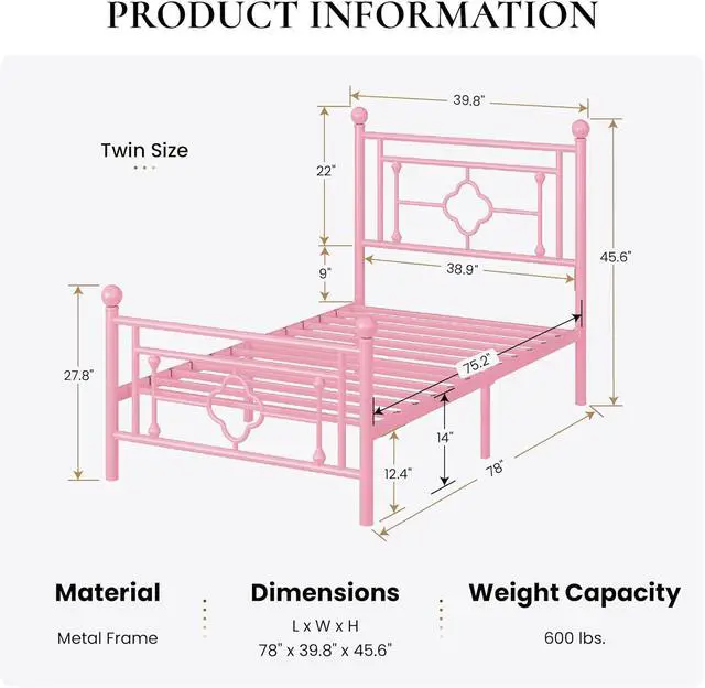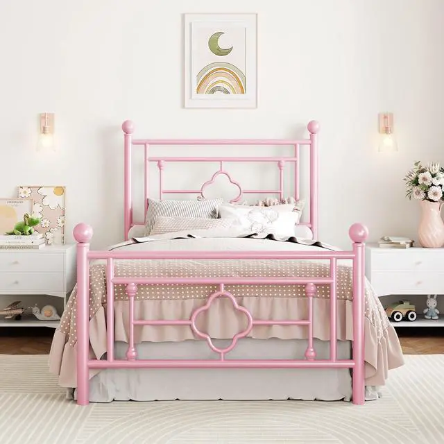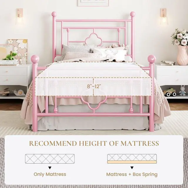 SHA CERLIN 14 Inches Twin Size Metal Platform Bed Frame/Vintage Iron-Art Headboard and Footboard/Mattress Foundation for Storage/No Box Spring Needed/Noise-Free/Easy Assembly/Pink