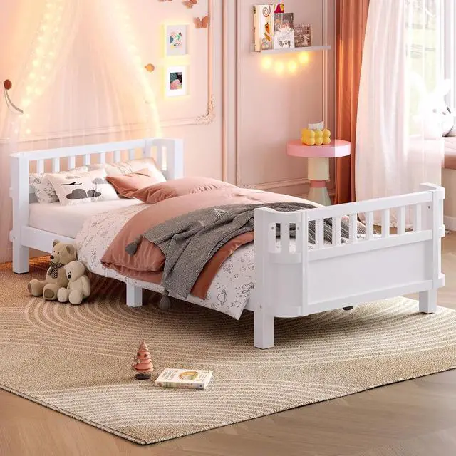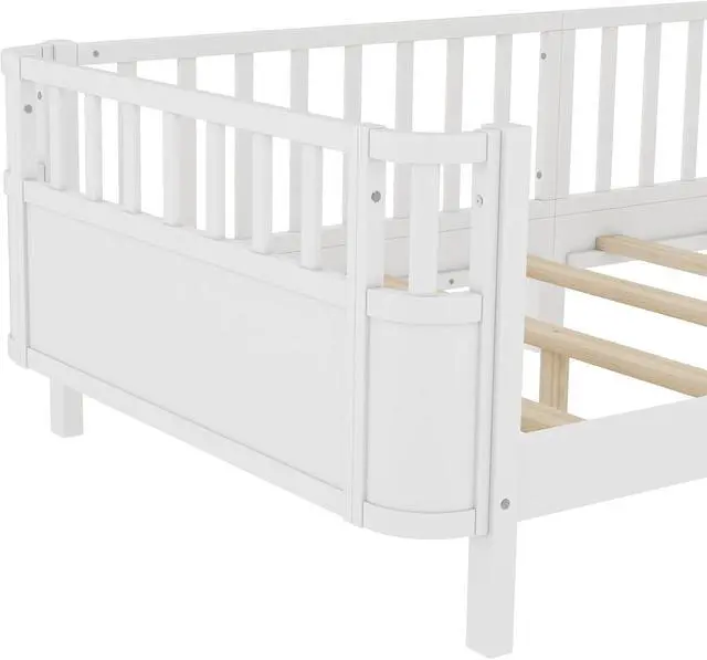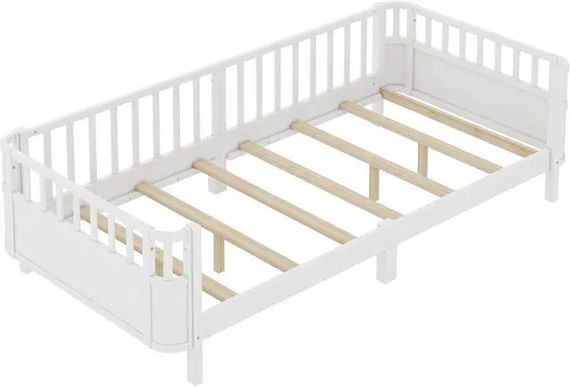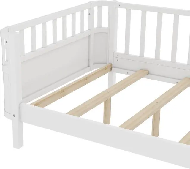 Bellemave Twin XL Montessori Bed with Fence and Slats, Twin XL Low Platform Bed Frame with Detachable Side Bed Rails and Rounded Corner Design, Easy Assemble Montessori Bed White
