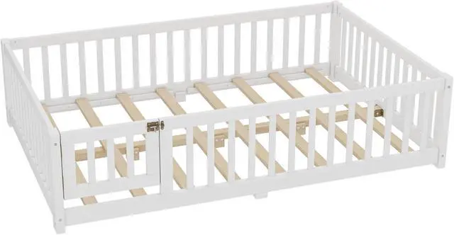 Bellemave Full Size Floor Bed with Slats and Safety Guardrail, Full Size Montessori Floor Bed with Fence and Door, Easy Assemble Montessori Beds for Kids, Girls, Boys, White