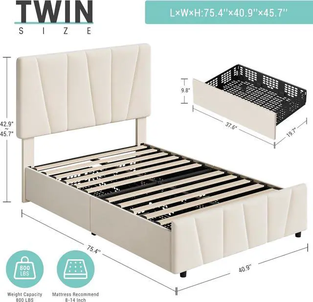 Twin Size Bed Frame with Adjustable Headboard and 2 Storage Drawers, Velvet Upholstered Tufted Twin Platform Bed Frames with Wooden Slats Support, Bedframe No Box Spring Needed, Beige/Cream