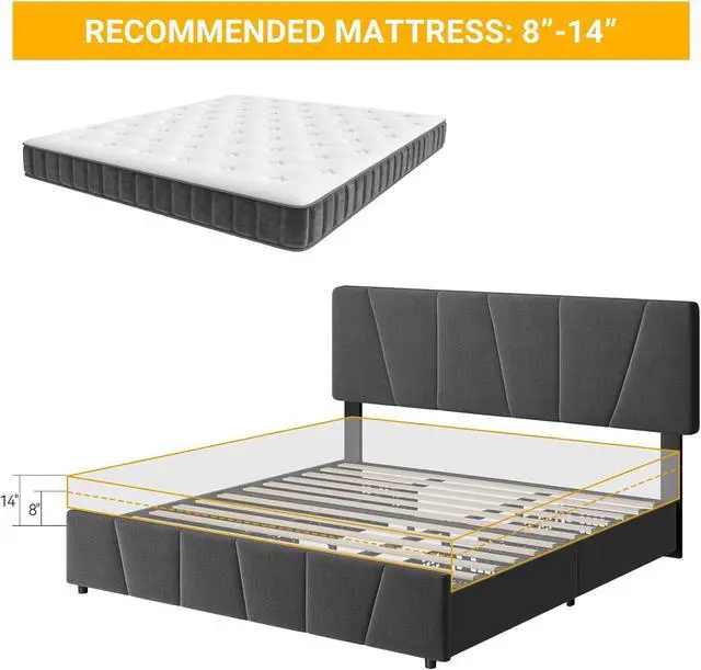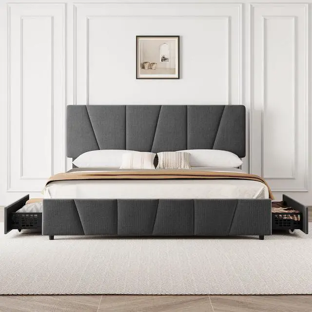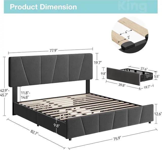 GarveeHome King Size Bed Frame with Adjustable Headboard and 4 Storage Drawers, Soft Upholstered Platform Bed Frames with Wooden Slats Support, No Box Spring Needed, Dark Grey
