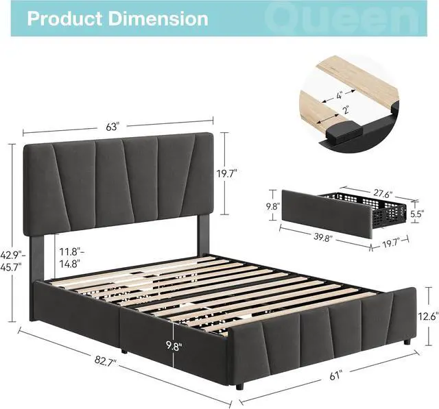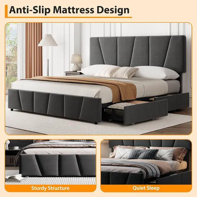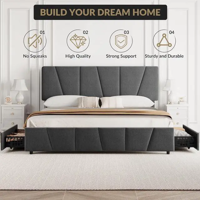 GarveeHome Queen Size Bed Frame with Adjustable Headboard and 4 Storage Drawers, Soft Upholstered Platform Bed Frames with Wooden Slats Support, No Box Spring Needed, Dark Grey