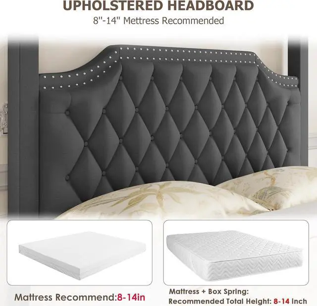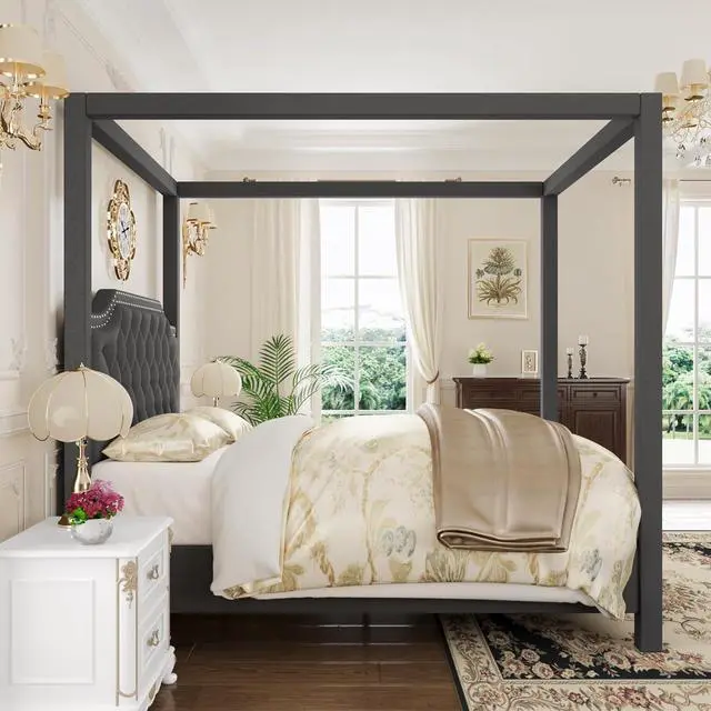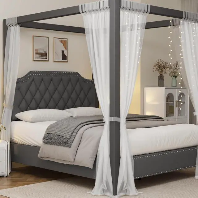 Special Feature Upholstered Canopy Bed Frame with headboard, Button Tufted, Nailhead Trim Design