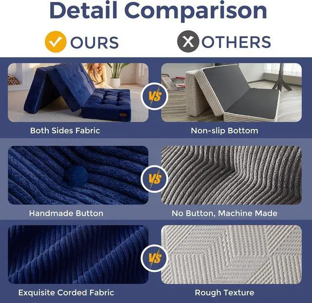 Tufted Craft Design: The topper of the foldable triple-fold mattress, made of ultra-soft and breathable corduroy fabric on the top, can keep you feeling fresh. The tufted crafting design adds a personalized style to the foldable mattress and also brings fun to your life