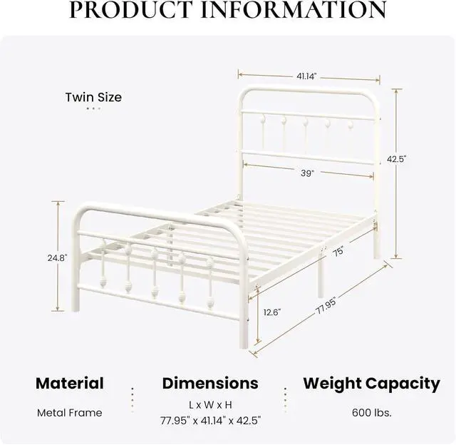 Quick & Simple Assembly: Designed for effortless assembly, this metal bed includes all required tools and features an intuitive design that lets you set it up in about 30 minutesno box spring needed